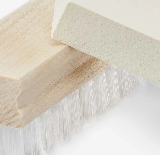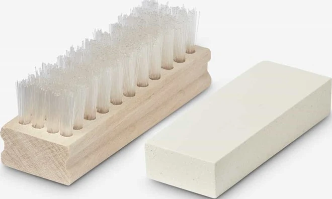 - Suede and nubuck care kit that includes cleaning eraser and wooden brush with nylon bristles